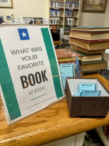 As we get ready to say hello to a new year, we are taking a look back at the most popular books of 2024! Click the button below or drop by the Circulation Desk through the end of the year and let us know what your favorite read of 2024 was. We’ll compile a list and let everyone know the results – a great way to start your 2025 TBR list!